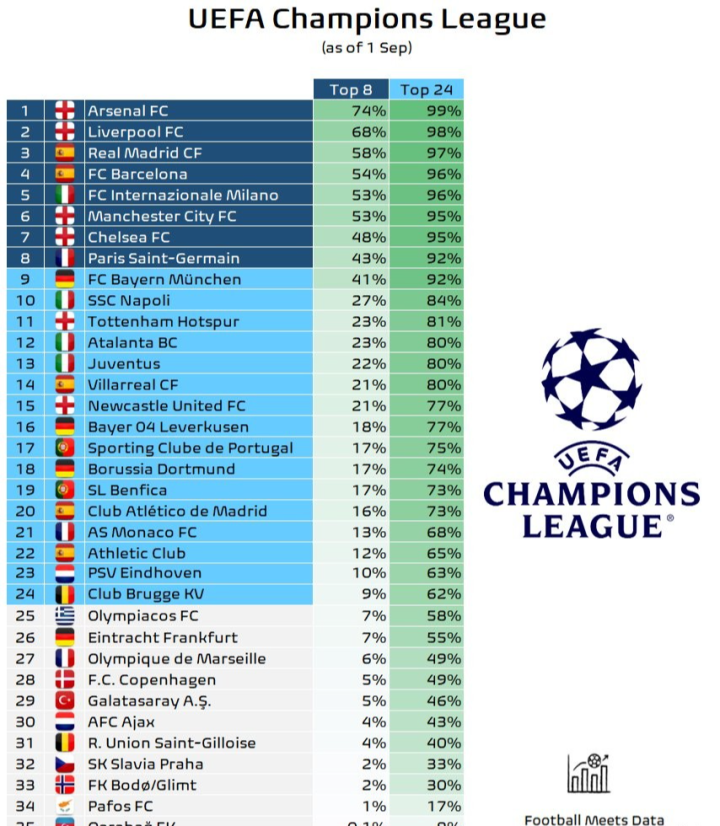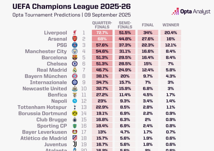 临近9月中旬的晚间,Opta发布最新的欧冠详细预测