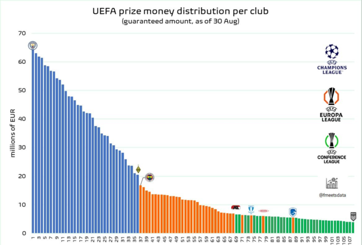 从25/26赛季108支参加欧战球队的初始奖金的对比其实不难看出,欧冠无疑还是收入最高的赛事--在欧冠36强初始金额最低的阿拉木图凯拉特的2050万欧元,甚至都要比欧联初始收入第一名的费内巴切高出360万欧元,更是比欧协联的第一阿尔克马尔高出了1381万欧元!