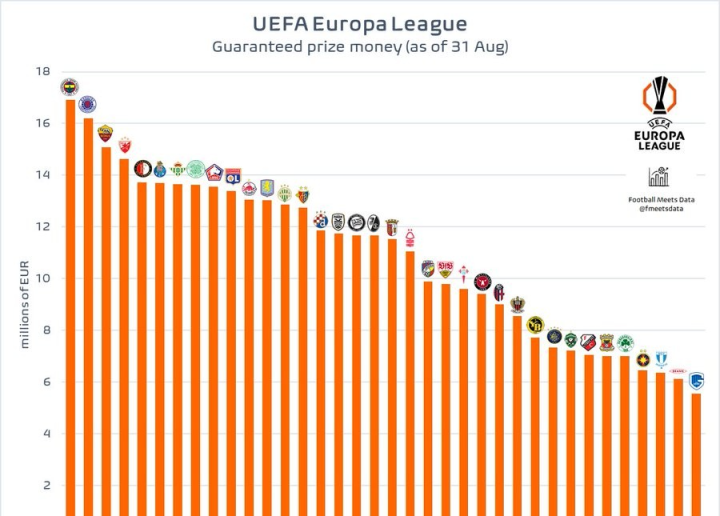 欧联36强中,费内巴切是初始奖金收入最高的球队、1690万欧元,而在他之后的格拉斯哥流浪者也有至少1600万欧元的保底入账。初始奖金收入最低的则是比利时球队亨克、560万欧元;