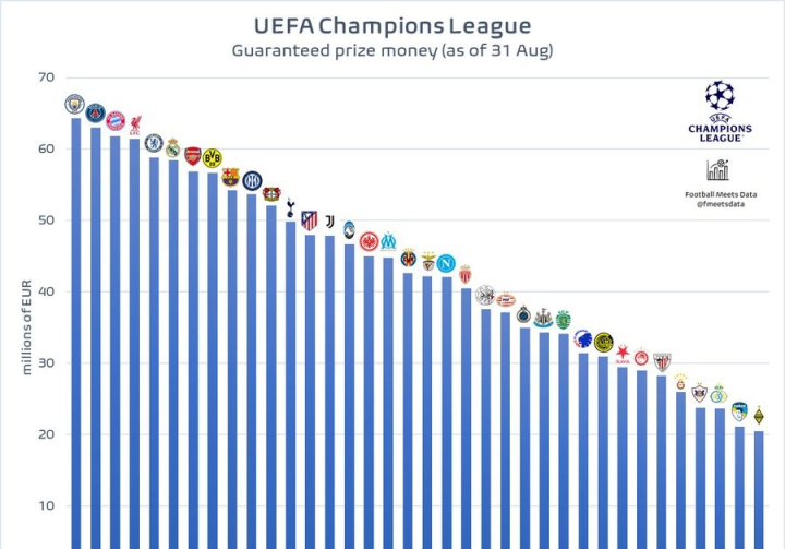 8月底,足球媒体Football Meets Data,发布了一份最新的欧战球队的初始收入明细。