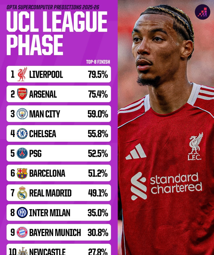 如果此时我们再对比上文其他两大媒体的预测结果就不难发现,对于本赛季欧冠联赛阶段的前8名,的确就“逃不出”这8支球队--利物浦,阿森纳、曼城、切尔西、巴黎、皇马、巴萨、国米。